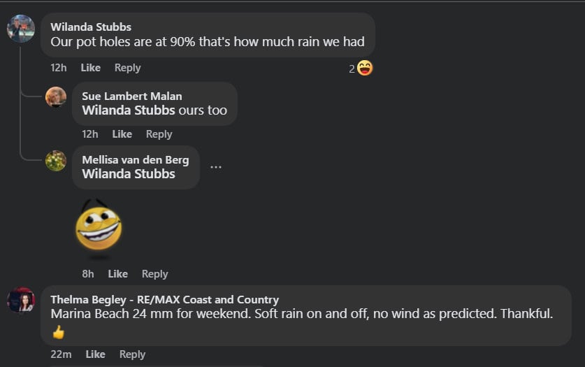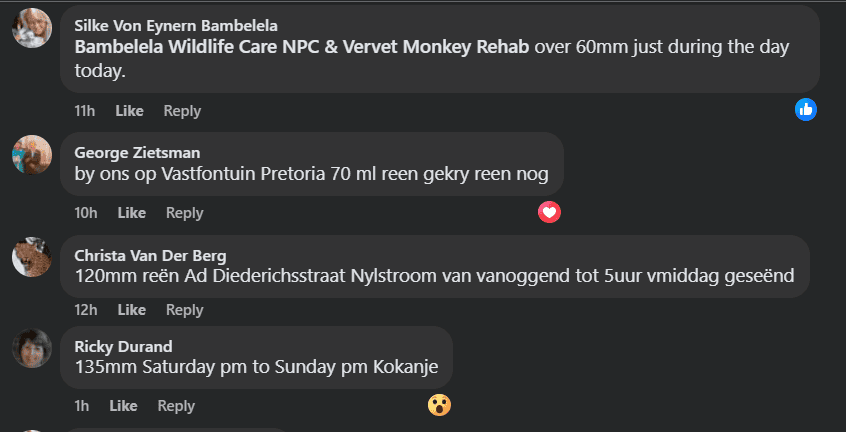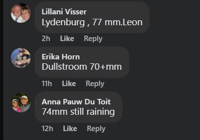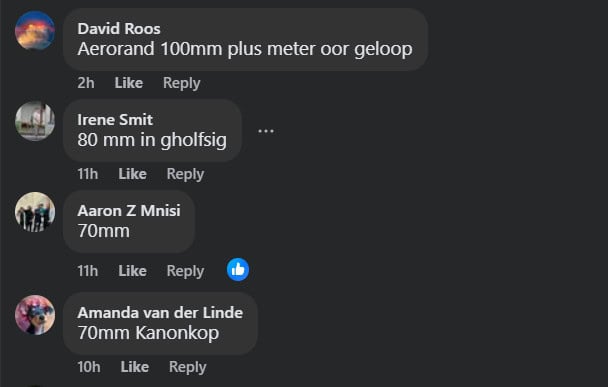 In other parts of KZN, Michelle Gelderbloem commented on Newcastle Advertiser‘s post, saying that she measured 80mm in the town. Cheryl Hesom from De Jagersdrift in Dundee noted in Northern Natal Courier’s comment section that she measured 77mm in 24 hours.