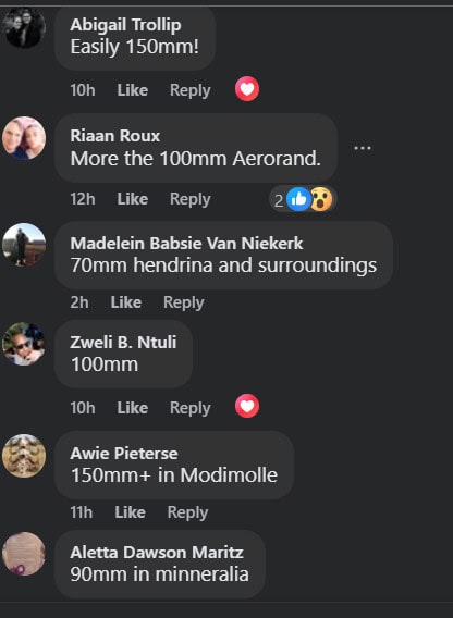 Another Modimolle resident, Ricky Durand, said they measured 135mm between Saturday afternoon and Sunday afternoon.