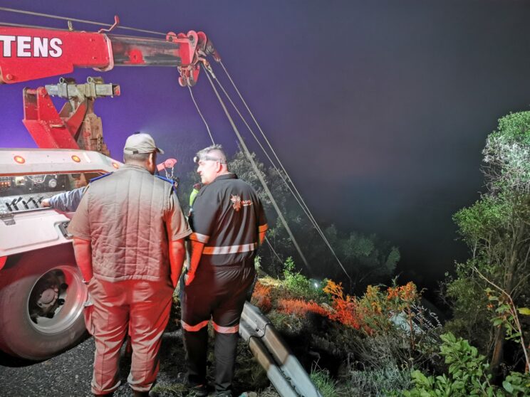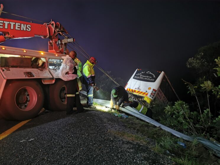 Van Wettens’ Rassie Erasmus, who has been in the breakdown service industry for almost three decades, waited until all the members of SARZA were up from the scene before he and his team attached cables to the bus from the rig and started the methodical process of lifting the bus up the embankment.