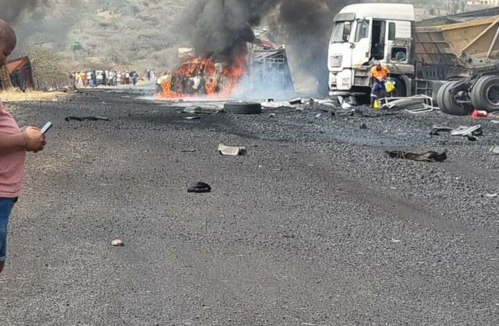 Emergency services providers on the scene confirmed the injuries and said six vehicles: Four trucks, a bakkie and a SUV were involved. Four vehicles caught alight after the secondary crash.