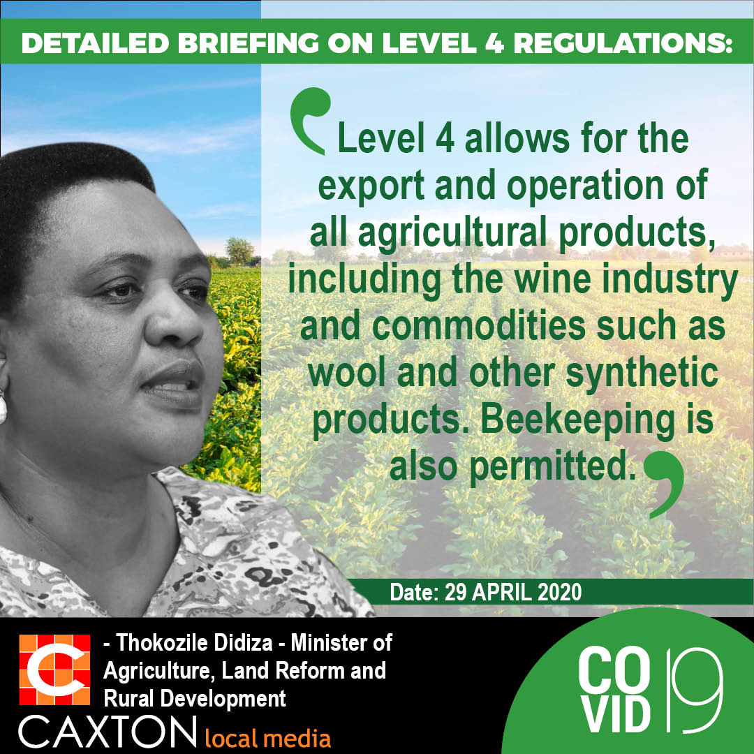 The Minister of Agriculture, Land Reform and Rural Development, Thoko Didiza on Wednesday evening detailed what measure have been eased in the agricultural industry as the country moves to lockdown level 4, starting on 1 May.