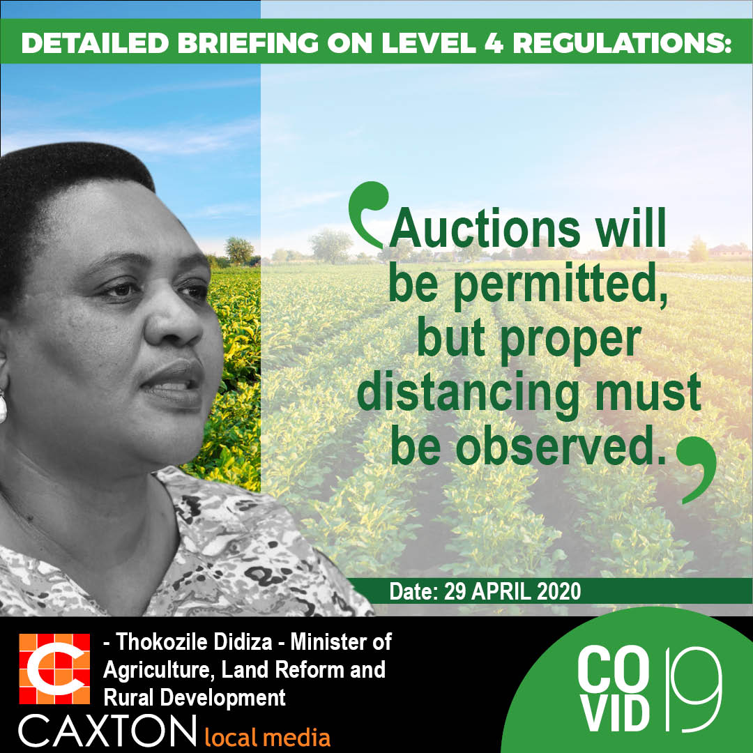 The regulations now state: that all agriculture, hunting, forestry, and fishing, bee-keeping including the preparation, harvesting, storage, transport of live animals and auctions, albeit under strict hygiene conditions, and related agricultural infrastructure and services, including research and inspection, certification and quality control, will be allowed when the new lockdown regulations.
