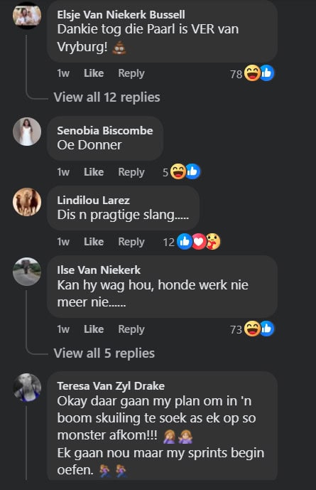 One comment, from Anton Eksteen, posted in Afrikaans but translated into English reads: “If you thought Usain Bolt was the world record holder in the 100m, wait until I spot a [snake] like this… Usain Bolt would look like an amateur.”