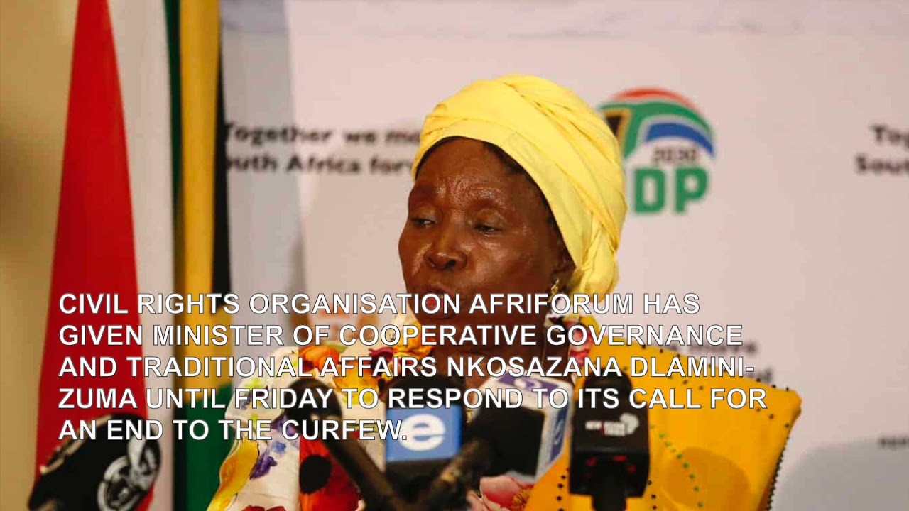Civil rights organisation AfriForum has given Minister of Cooperative Governance and Traditional Affairs Nkosazana Dlamini-Zuma until Friday to respond to its call for an end to the curfew.