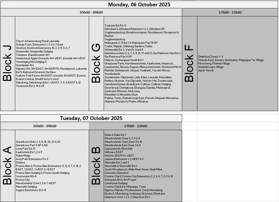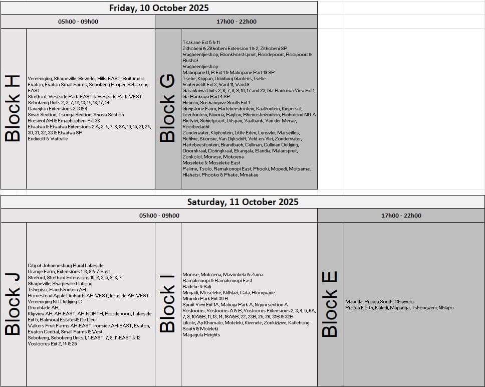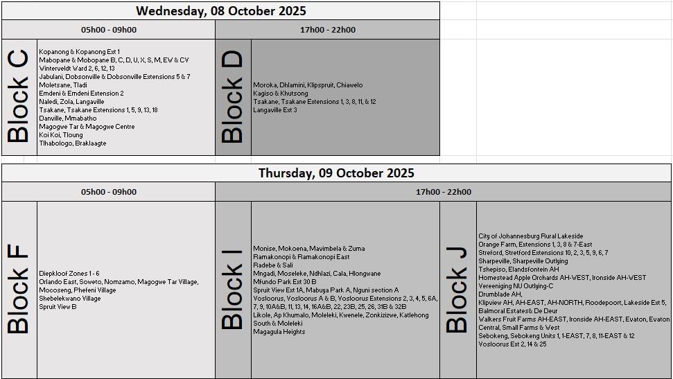 Other affected regions include Orange Farm extensions, Ivory Park, Kaalfontein and various settlements across Gauteng.