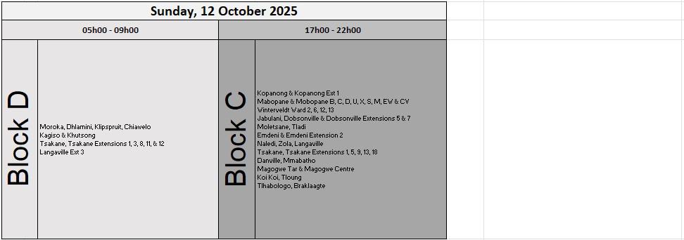 Evening load reduction between 5pm and 10 pm will impact regions including Tsakane, Zithobeni, Cosmo City and surrounding areas.