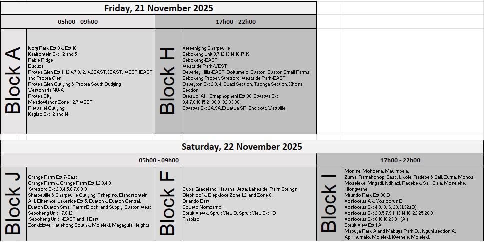Additional affected zones include Graceland, Havana, Daveyton, Vereeniging Sharpville, Rabie Ridge, and various extensions in surrounding regions.