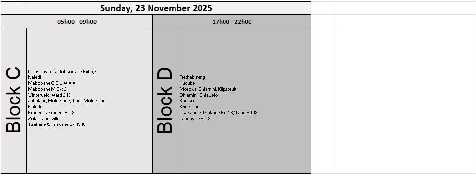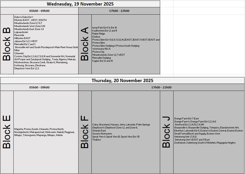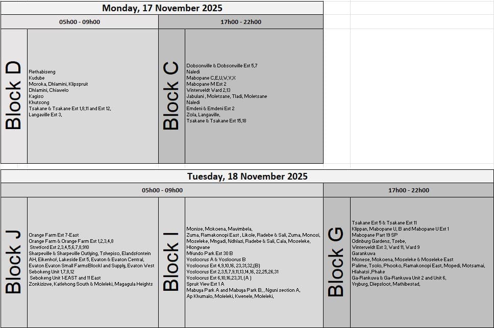 Specific outage times and durations will vary by location, in line with Eskom’s official load-reduction schedule.