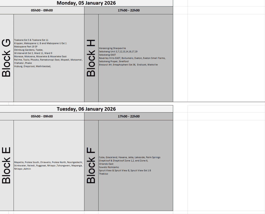 Areas that will be experiencing the morning load reduction that runs from 5am to 9am include Klippan, Mapetla, Duduza, Naledi and Protea North.