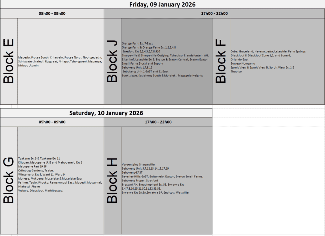 Areas are to be affected for 4-5 hours, varying per area, in accordance with Eskom’s official load reduction schedule. Residents and businesses in affected areas are urged to prepare for interruptions in advance.