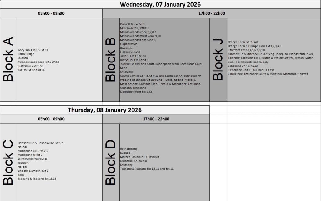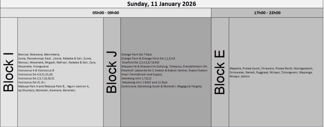 Other affected areas include Klipspruit, Eikenhof, Orlando East, Beverly Hills-East and Nooitgedacht.