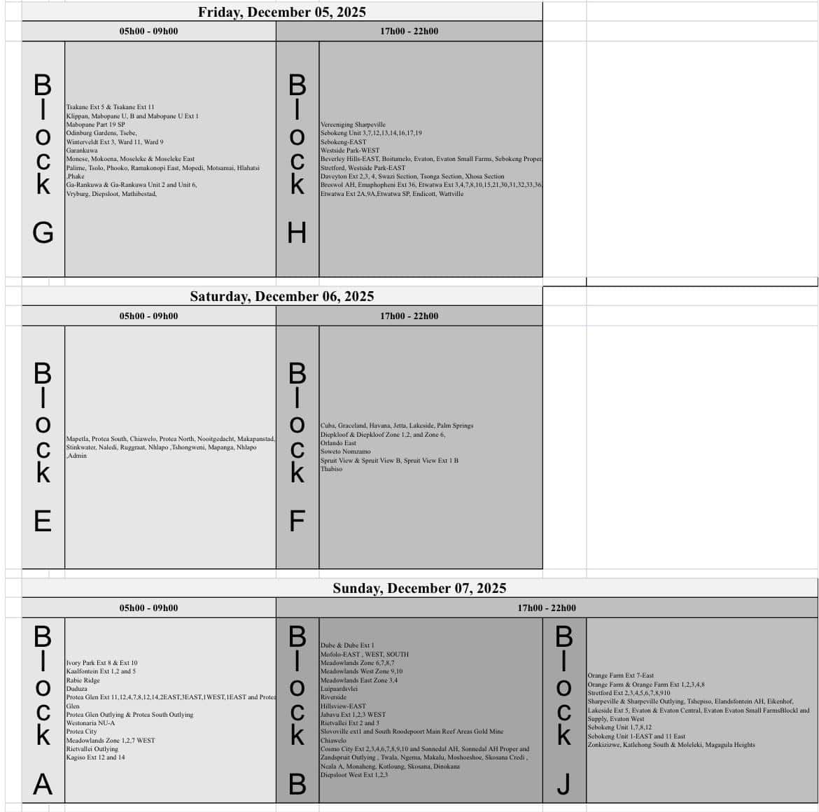 Areas experiencing morning load reduction (5am-9am) include Orange Farm and its extensions, Stretford and its extension, Sebokeng and Sharpville.