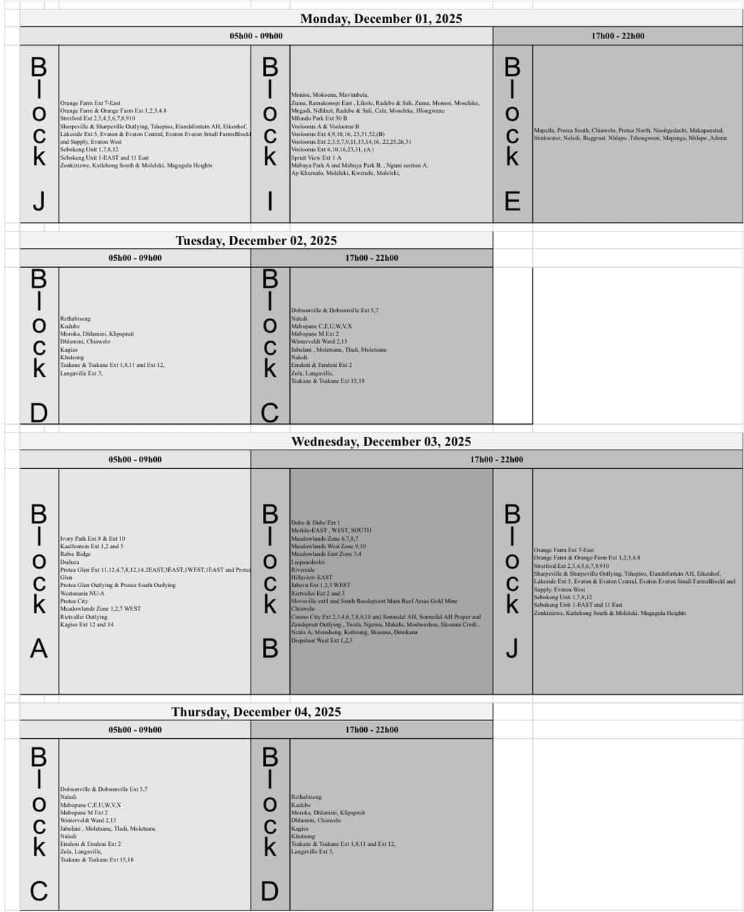 Load reduction schedule: Monday, 01 December – Sunday, 07 December
