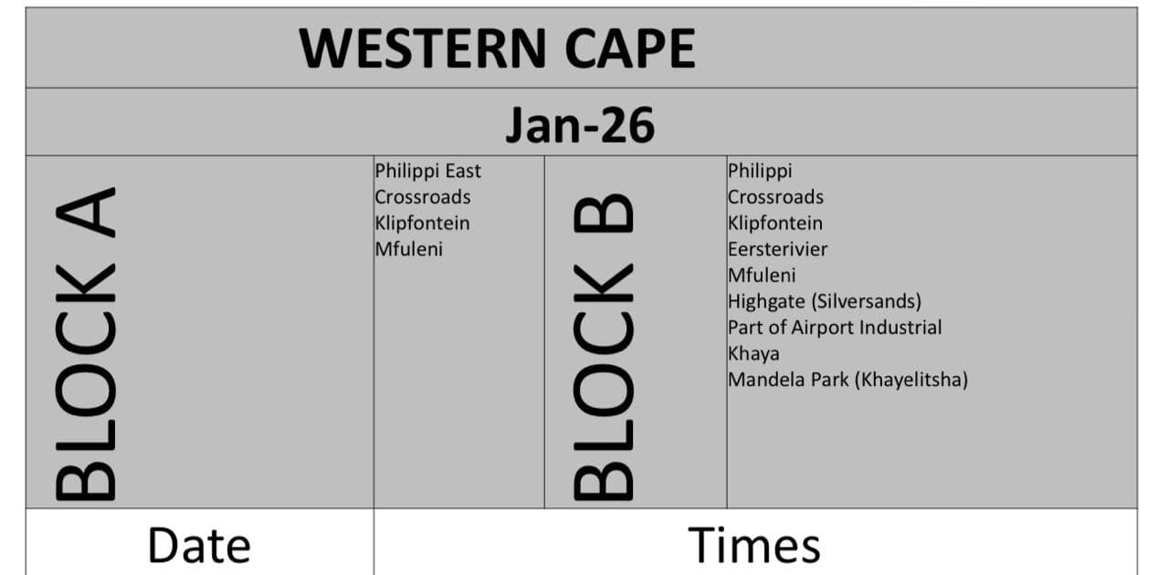 Other areas that will have outages during both periods include Klipfontein and Mfuleni.