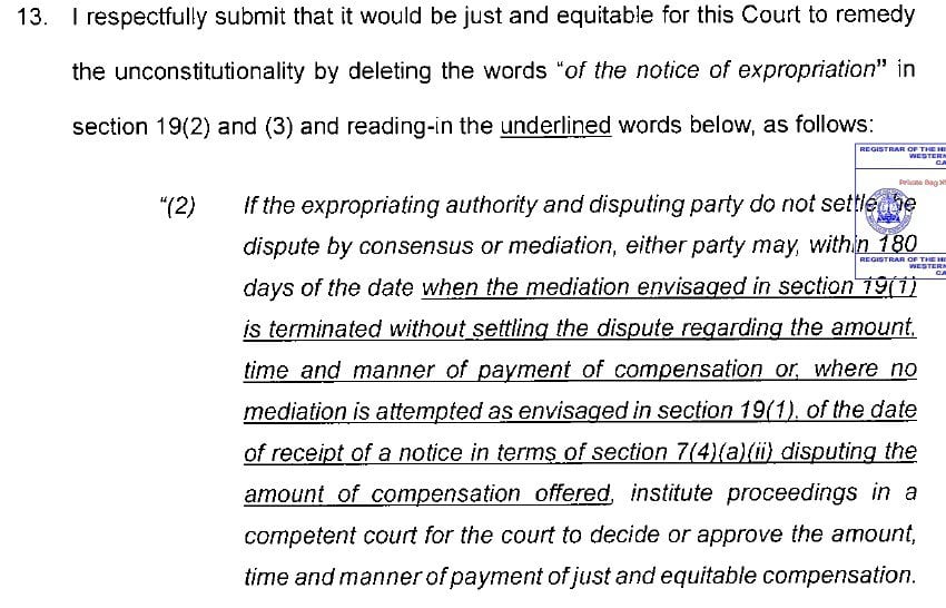 The president’s responding affidavit asked the high court to “remedy the unconstitutionality” by removing the term “notice of expropriation”.