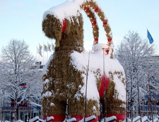 Today the Yule Goat has replaced the man-goat in Swedish tradition and giant versions are created out of straw and red ribbons, which have become easy prey for pranksters to set on fire each year.
