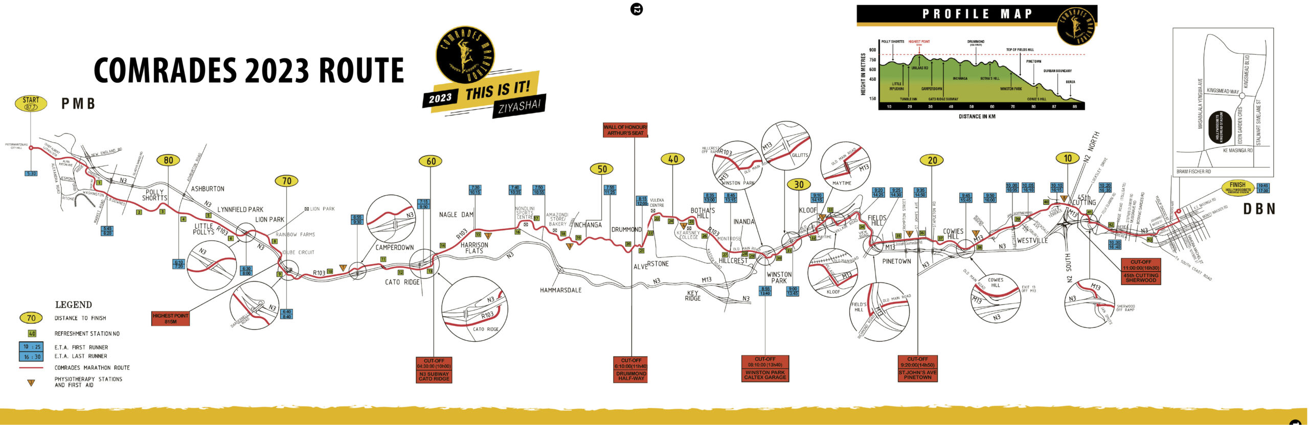 - The highest point on the course (820m) is situated at Umlaas Road, about 19km from Pietermaritzburg, and is unremarkable as it is not reached by any noticeable hill and probably goes unnoticed by most runners. A landmark is a concrete water tower on the other side of the freeway which passes near the route at that point.