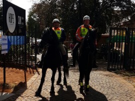 Police officers patrol the service alleys around Hope Church, a voting station in Auckland Park.