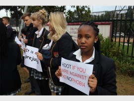 Pupils and teachers from the two schools gathered outside their respective premises, where they displayed boards and placards urging motorists to hoot against all forms of violence and xenophobia.