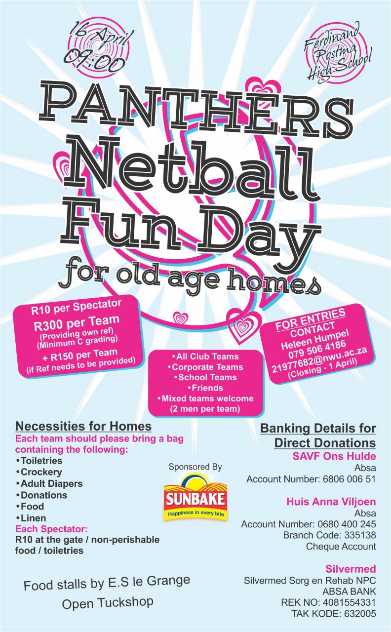 CommunityThe local Panthers Netball Club is arranging a netball fun day for old age homes at Ferdinand Postma High School…