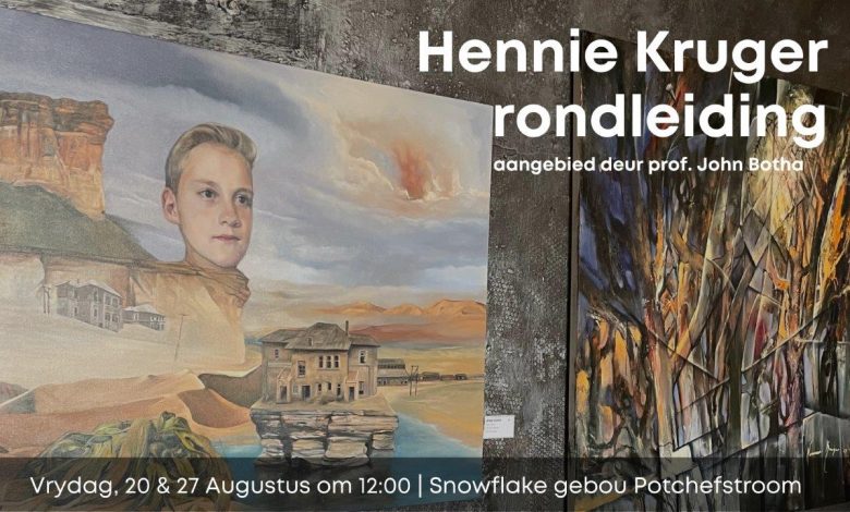 Prof. John Botha, eertydse kunsgeskiedenis dosent aan die NWU, sal die volgende twee Vrydae (20 & 27 Augustus) van 12:00-13:00 die publiek deur Hennie Kruger se kunsuitstalling rondlei. Die uitstalling het Dinsdag, 10 Augustus by die Snowflake-gebou geopen.