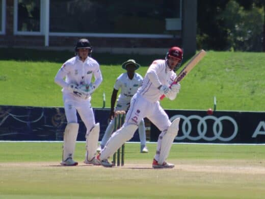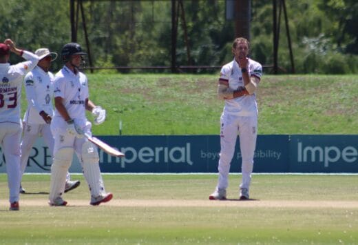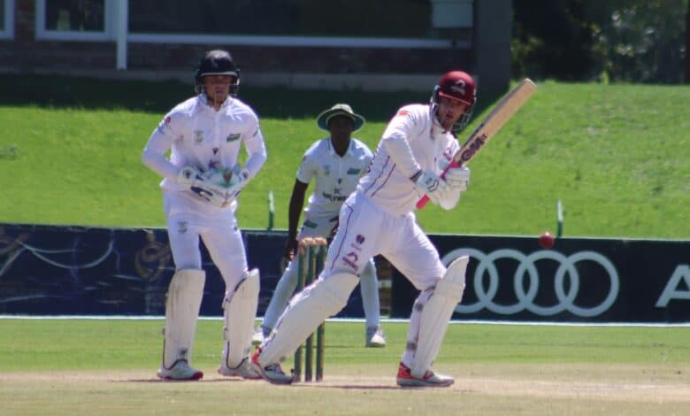 The Dragons’ second innings saw them hit 304/9 declared, in quick time with the two lefties, Lesiba Ngoepe (90 from 127 balls) and Rubin Hermann (101 from 135 balls) giving their team a chance to go for a win.