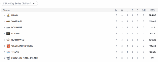 The points table shows how incredibly close the season had been. The Lions topped the table after an innings win against the wooden spoonists, Tuskers. Before the final round of matches, the Lions had been out of the top three. The Dolphins almost sneaked into the final after beating the second placed Warriors.