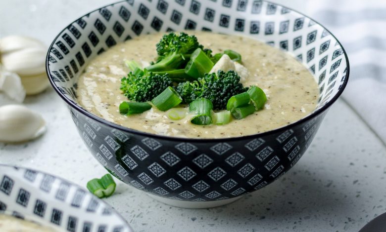 Ladle into soup bowls and garnish with small florets of steamed broccoli and finely chopped shallots or crumble feta cheese on top for a creamy finish.