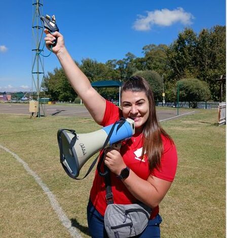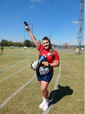 Juffrou Adelle Grobbelaar van Laerskool Randfontein maak geskiedenis as Randfontein se eerste vroulike atletiek-afsitter en baan die weg vir jong meisies in sportleierskap.