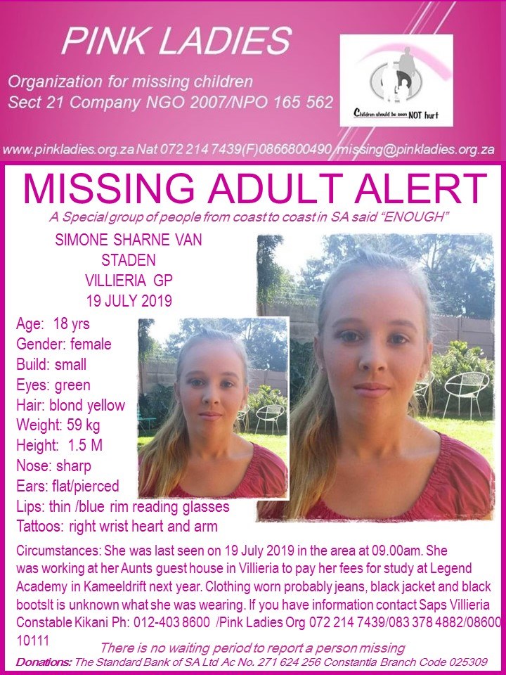 Local newsSimone Sharne van Staden (18) was last seen on 19 July 2019 around 09.00 at a guesthouse in Villieria.
