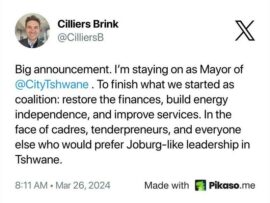 Op Dinsdag, 26 Maart het hy op X gesê: “Groot aankondiging. Ek bly aan as Tshwane-burgemeester. Om wat ons as koalisie begin het af te handel: die finansies te herstel, energie-onafhanklikheid te bou en dienste te verbeter. In die aangesig van kaders, tenderpreneurs and alle andere wat ’n Joburg-tipe leierskap in Tshwane sou verkies.”