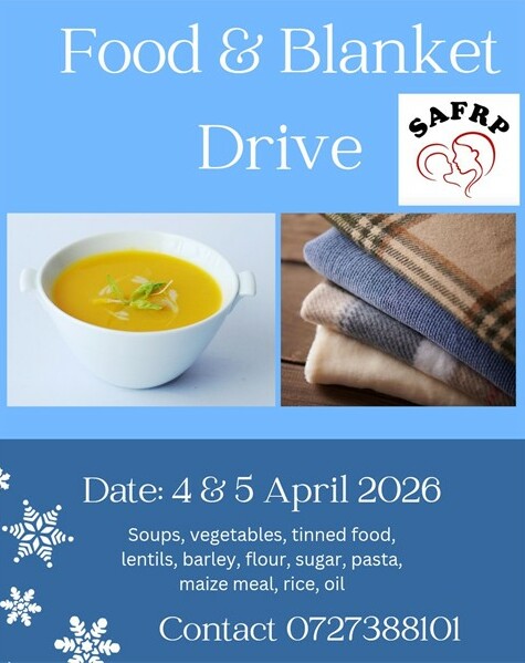 Drop off non-perishable food and blanket donations at the farm. Leigh 072 738 8101 or Anne Botha 082 454 8384.
