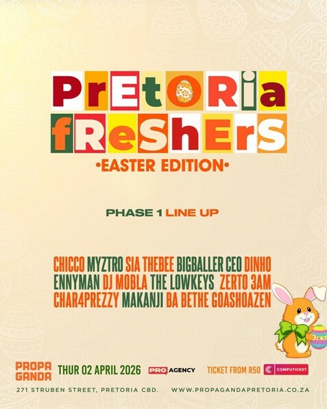 Lineup: Chicco, Mystro, Sia Thebee, Bigballer CEO, Dinho, Ennyman, DJ Mobla, The Lowkeys, Zerto 3AM, Char4Prezzy, Makanji, Ba Bethe Goashoazen. Student lifestyle, African cuisine, drink specials, hubbly, amapiano, house music, afrohouse, Hiphop, DJ set, pool. Tickets at Computicket.