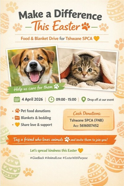 Donate pet food (dog or cat), bring blankets, towels or pet bedding. Share love and kindness with animals in need. Starts 09:00 until 15:00. 082 777 5338.