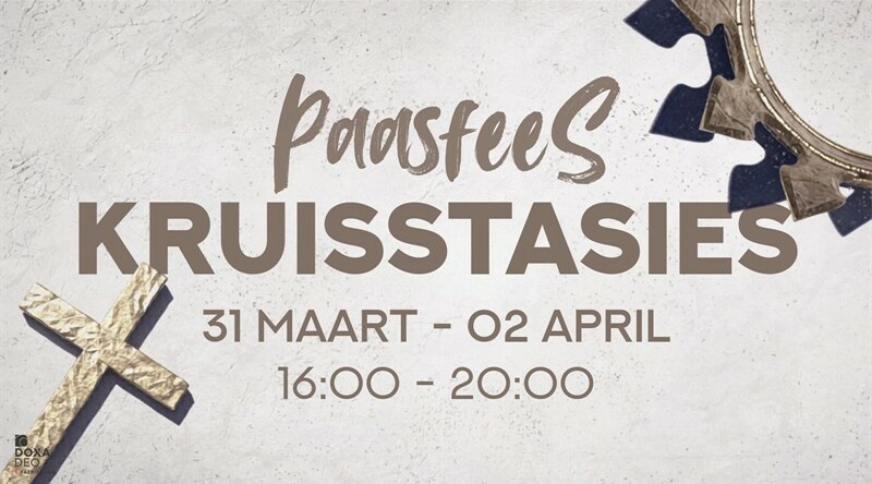 Die Kruisstasies, ook bekend as die Stasies van die Kruis of Via Dolorosa, is ’n Christelike meditasie- of gebedsreis wat die finale ure van Jesus Christus se lewe gedenk, vanaf sy veroordeling tot sy kruisiging en begrafnis. Jy is welkom alleen deur te kom stap, as gesin of selgroep. Daar is verskillende stasies, waar jy deur begeleiding van ’n stemnota (voice over) gelei sal word met duidelike instruksies. NB: Bring gerus ’n paar oorfone saam asook jou foon om die QR Kode te scan. Daar sal ook ’n gedrukte kopie wees indien jy nie die QR Kode kan scan nie. Tyd: 16:00-20:00.