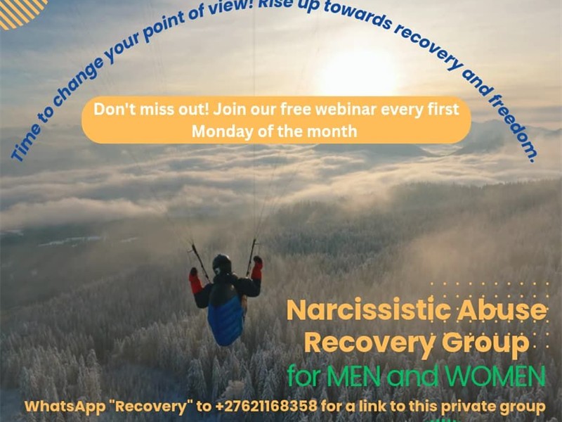 Every first Monday of the month. Time: 19:00–20:00. We meet monthly, free and online via Google Meet. The sessions are facilitated by an expert on toxic relationship abuse, Karien Jordaan. Find answers you need and recover from abuse. A 30-minute educational on a topic to help you understand what narcissistic abuse is all about, why you have been affected and how, followed by 30 min Q&A. Resources for recovery are provided on our WhatsApp group. Contact Karien Jordaan, 062 116 8358. You must be 18yrs or older to join.
