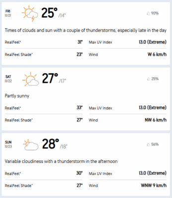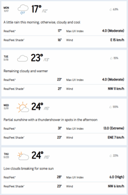 According to AccuWeather’s forecast for this week, daytime temperatures will peak between a cool 17°C and 28°C.