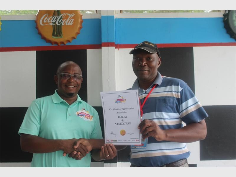 Jimmy Manaka with Cornelius Mahlangu as he receives a certificate of appreciation on behalf of the Department of Water and Sanitation.