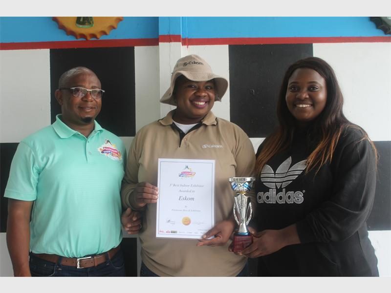 Jimmy Manaka and Tumelo Monareng with Junitar Chaba who accepted the certificate on behalf of Eskom for the third best indoor exhibitor.