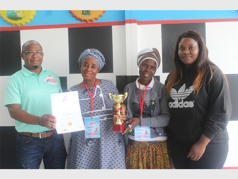 Jimmy Manaka and Tumelo Monareng hand over a certificate and trophy for the second best indoor exhibitor for traditional beading to Jane Tsebe and Maria Chikana.