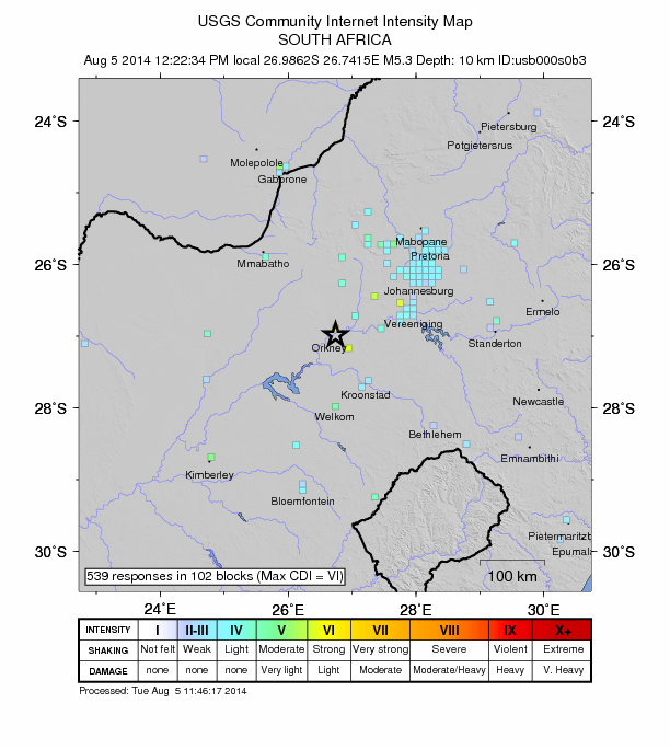 Volgens die USGS National Earthquake Information Center het die skudding omstreeks 12:22 begin en het dit 5,3 op die Richterskaal geregistreer.