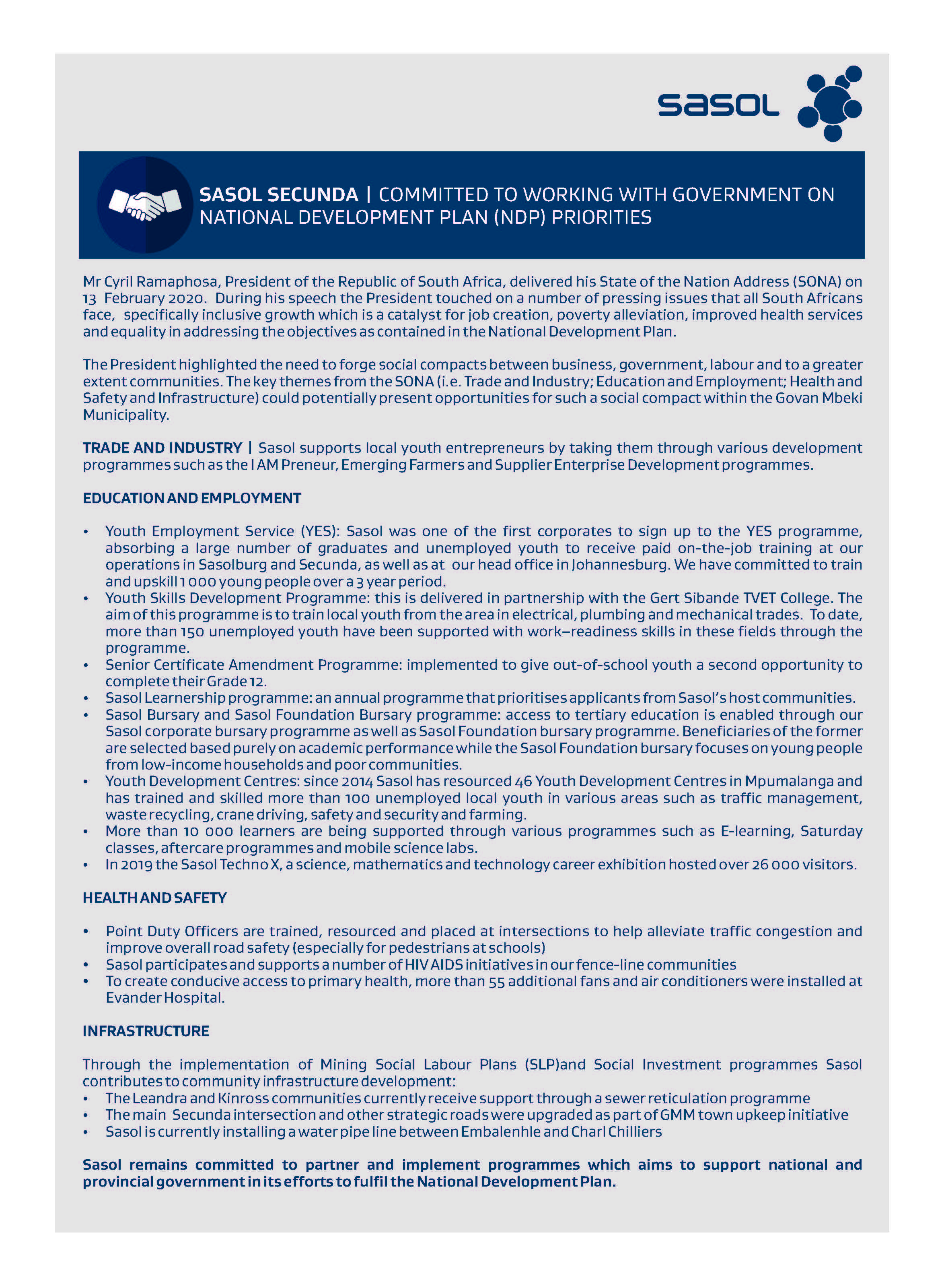 Sasol remains committed to partner and implement programmes which aims to support national and provincial government in its efforts to fulfil the National Development Plan.