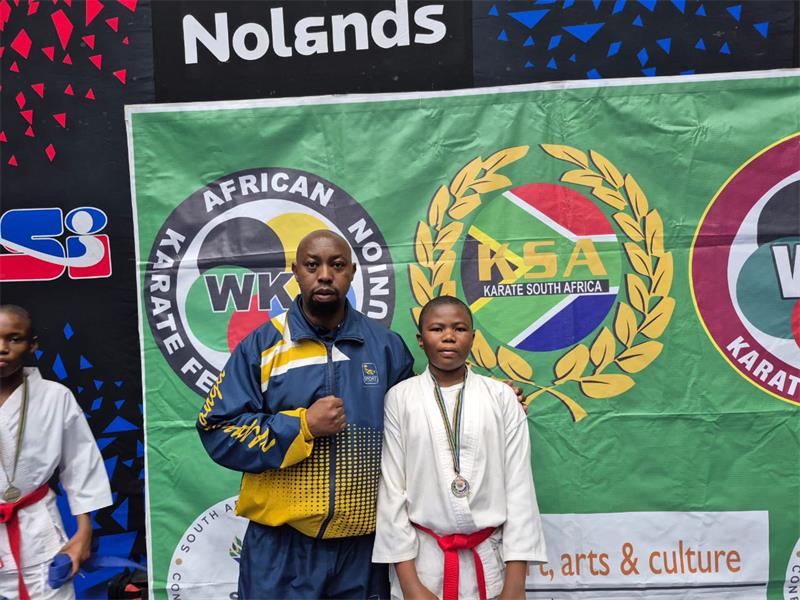 Sensei Breshnev Dhlamini is with Lungile Mavundla, who took third place in the boys' 12 to 13 years kumite.