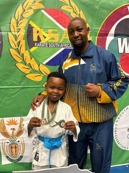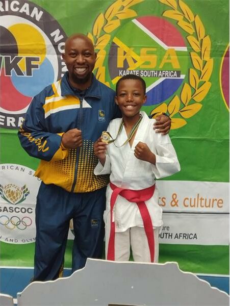 Sbongokuhle Mahlangu won in the boys ages 8 to 9 years kumite category and got third place in kata. Photographed with him is Sensei Breshnev Dhlamini. Photo: Supplied