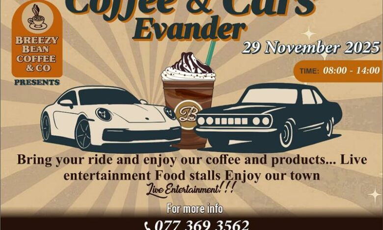 The coffee and Cars event will take place at the Breezy Bean Coffee & Co in 68 Solly Zwane Street, in Evander, on November 29.