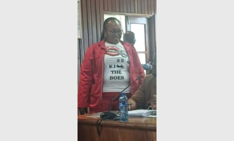 The T-shirt donned the phrase ‘Kill the boer’, with the ‘ll’ was crossed out and replaced with ‘ss’, turning the phrase into ‘Kiss the boer’.
