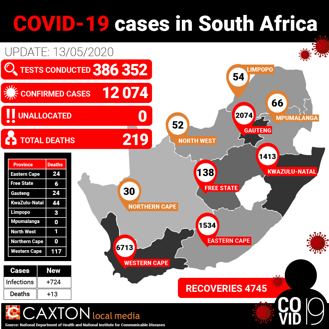 Covid-19 cases increase by 724 to 12 074