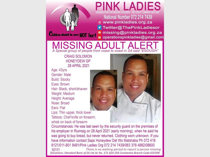Solomon was last seen by a security guard on the premises of his employer in Ruimsig on the morning of 28 April when he was going to buy bread but never returned.