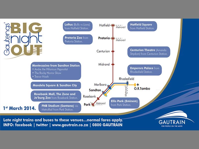 JOBURG - Gautrain, in conjunction will Primedia, will launch 'Gauteng's big night out', a service that will see Gautrain's trains…