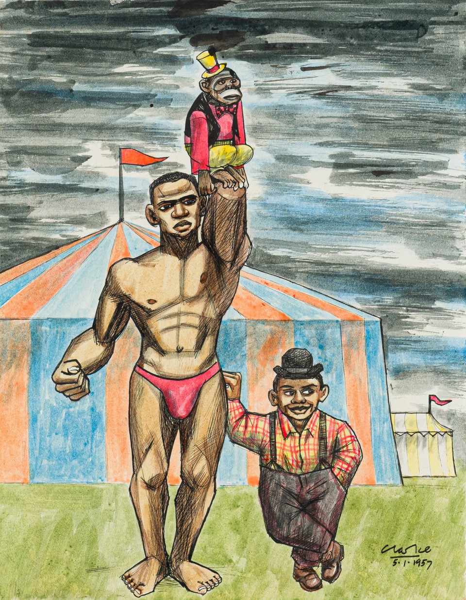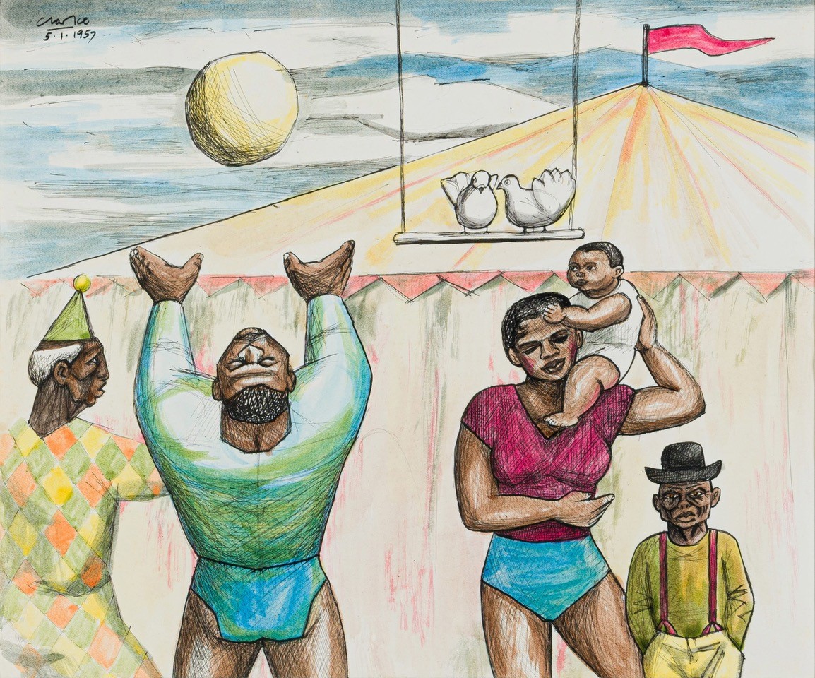 Peter Clarke, an accomplished printmaker, poet and painter, is represented in the auction by two early watercolours depicting circus entertainers (estimate R150 000 – 200 000 each). They are dated 1957. Two years earlier Clarke won a South African literary award, which led to a vibrant exchange of letters with American poet Langston Hughes, a key figure in the Harlem Renaissance.